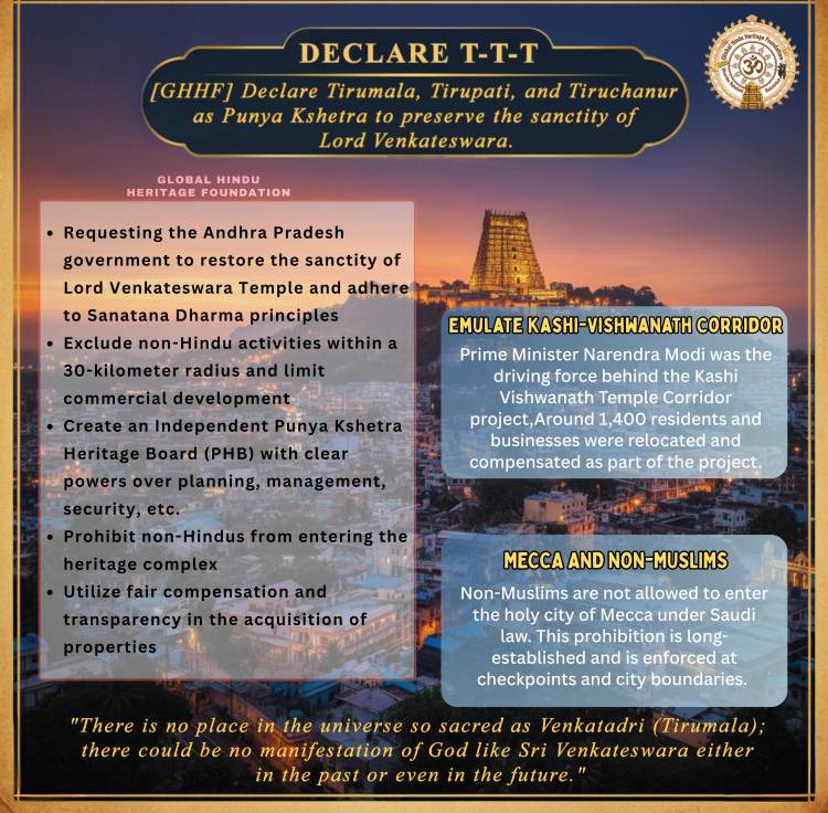[GHHF] Declare Tirumala, Tirupati, and Tiruchanur as Punya Kshetra to preserve the sanctity of Lord Venkateswara.