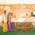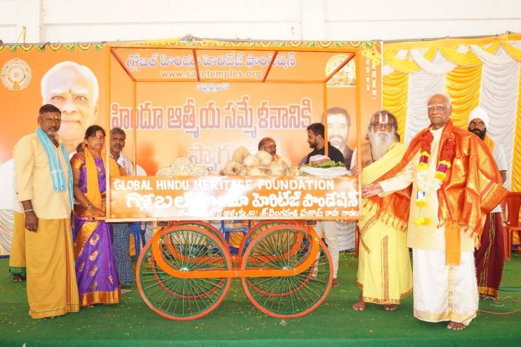 First, the founder of the Global Hindu Heritage Foundation, Shri Velagapudi Prakash Rao, was welcomed to the venue with great pomp and show of respect from the Ambedkar Circle on a horse-drawn carriage, singing bhajans, dancing, playing wood bhajans, dressed in traditional attire, and chanting Jai Shri Ram, Jai Jai Shri Ram with saffron flags.