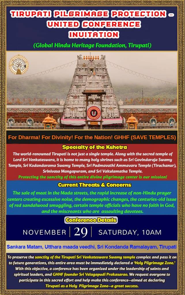 [GHHF] Venue changed: on November 29th. In Tirupati, a huge meeting is being held to initiate the need for declaration of Tirumala, Tirupati and Tiruchanur as Punykshetra. Request you and your friends to attend.