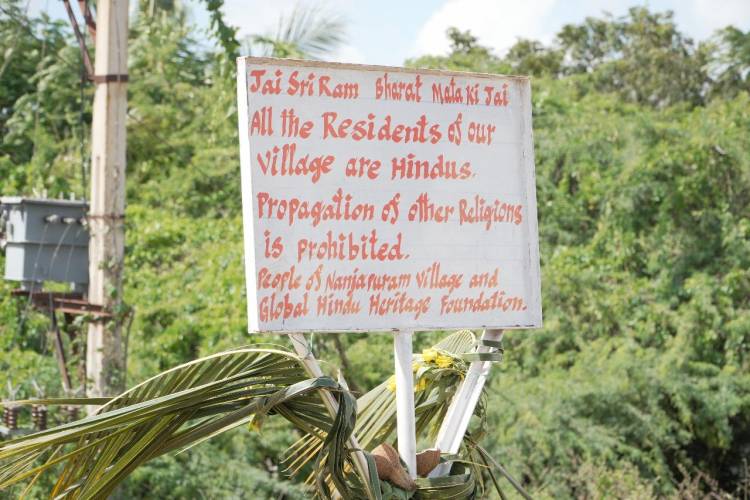 The villagers erected a sign on the highway saying that “This is a Hindu Village. No other faith are allowed to do any propagation.” It is written in English and Telugu languages.