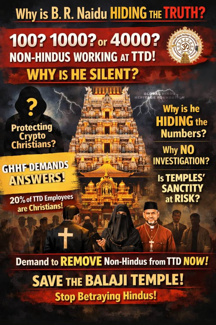 Every Chief Minister, TTD Board Chairman, and executive officer knows fully well that thousands of Christians work at TTD. It is not politically palatable for government officials to conduct a thorough investigation. For nearly 15 years, the Global Hindu Heritage Foundation has been saying that as many as 20 percent of TTD employees are Christians, hurting the sentiments of Hindus, vitiating the sanctity of Balaji Temple, demeaning our Gods, making fun of Hindus worshipping different Gods, and so on.