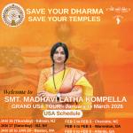 Smt. Madhavi Latha Kompella is a true representative of Nari Shakti, Sanatani, Vedic scholar and by profession the CEO & MD of Virinchi Hospitals in Hyderabad. To nurture and sustain Sanatana Dharma for future generations, with a special focus on guiding youth and empowering women, we are honored to engage with her inspiring spiritual leadership to promote Sanatan Dharma by energizing, awakening and motivating the communities in 45 days at several places in USA as per the details of venues, timings and local contacts at https://SaveTemples.org/page/mlk-usa
