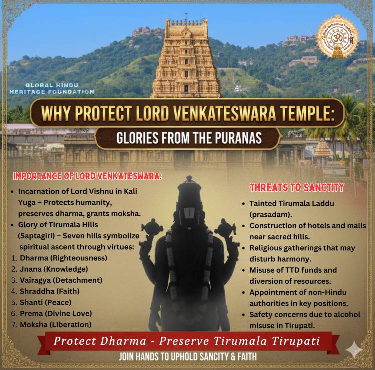 The Puranas depict Lord Venkateswara as the compassionate protector of humanity in Kali Yuga. His temple at Tirumala stands as a beacon of hope, dharma, and spiritual transformation. Through devotion—chanting his name, offering prayers, and surrendering to him—devotees can overcome challenges and attain spiritual liberation. Every Hindu should be aware of the glories of Lord Venkateswara and the potential danger of ruining the sanctity by the selfish politicians, and also the commitment of other faiths to wipe out Hinduism in India. It is the Dharma of every Hindu to protect and preserve the sanctity of Tirumala–Tirupati, the abode of Lord Venkateswara, who is considered the Lord of Kali Yuga.